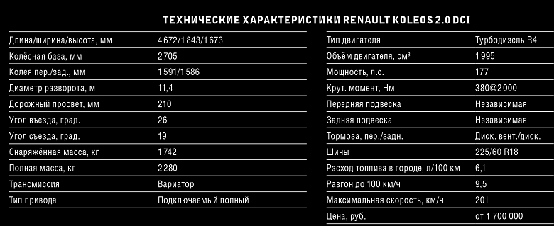 Renault Koleos на российском рынке существует в двух комплектациях — Executive и Premium. Первая попроще и полагается машинам с 2.0-литровым 144-сильным бензиновым мотором. Вторая может иметь под капотом 2.0-литровый 177-сильный дизель или 2.5-литровый бензиновый двигатель мощностью 171 л.с. При этом дизельной версии не полагается система дистанционного запуска — по мнению инженеров фирмы, обладатели дизельных моторов из северных регионов в любом случае будут устанавливать автономный подогреватель.