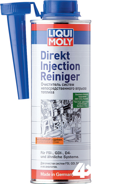 А что делать, если мотор уже начал подрагивать на холостых и не так бодро заводится морозным утром? На этот случай есть более серьёзный препарат – Direkt Injection Reiniger. Это специальное средство для очистки форсунок непосредственного впрыска систем GDI, FSI и D4. По эффективности воздействия присадка сравнима с очисткой на специальном сервисном стенде. Состав исключительно сильных моющих добавок, работающих при повышенных температурах быстро удаляет нагар, смолы и отложения, то есть всё, что обычно откладывается на форсунках. Правда, его нельзя доливать постоянно, а лучше применять на регулярном ТО или при возникновении подозрений появления вредоносных отложений. Флакончика в 500 мл средства хватает на 70 л топлива, а для начала действия достаточно просто влить присадку в бак и запустить двигатель.