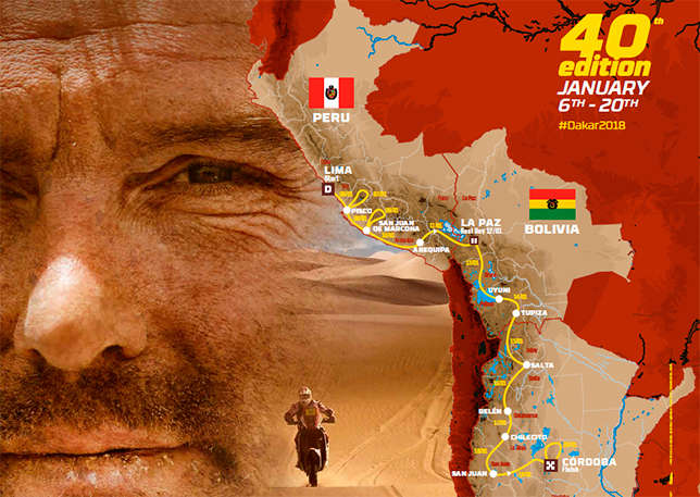 Организаторы ралли-рейда «Дакар» представили маршрут юбилейной, 40-й гонки, которая пройдёт c 6 по 20 января 2018 года в Южной Америке. Знаменитый марафон на этот раз стартует в Лиме, столице Перу, пересекает высокогорную Боливию и финиширует в Аргентине, в Кордобе.