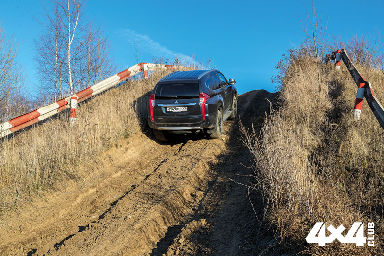 Лично мы отправились искать приключения на внедорожную часть полигона к тарированным горкам, построенным для испытаний полноприводных грузовиков. Правда, пришлось немного подождать, пока сервопривод включит пониженную передачу (долгое переключение между режимами — особенность, передающаяся у Pajero Sport по наследству). Зато она в полной мере компенсируется прекрасной работой противобуксовочной системы, способной подстраиваться под конкретные условия. На выбор есть несколько программ «Грязь/снег», «Песок», «Гравий», «Колея». Штатной блокировкой заднего дифференциала пользоваться почти не приходилось, тем более что одновременно с её подключением вырубаются все электронные помощники. Даже ABS. На крутом грунтовом подъёме электроника оказалась полезнее, противобуксовочная система прикусывала буксующие передние колёса до полной остановки, наверх удалось подняться без разгона, а съехать вниз помогла система помощи при спуске, которая с успехом заменяет старый джиперский приём с включением первой пониженной.