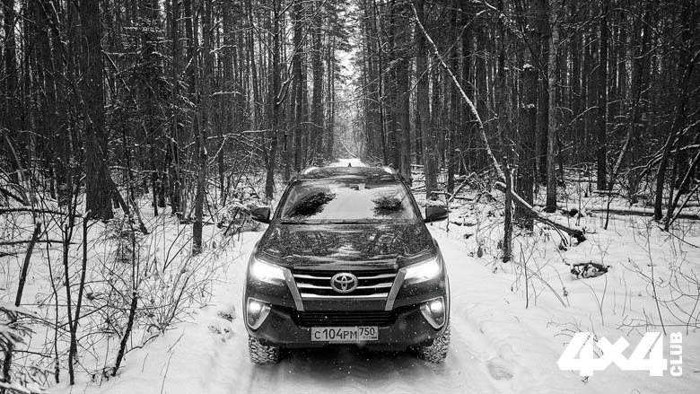 …Буквально через несколько километров после Волоколамска сворачиваем направо, и перед нами возникает красивая укатанная снежная дорога. Её ширина и отсутствие трафика позволяют провести интересный эксперимент. Ставим Toyota посередине дороги и вдавливаем газ в пол. Задний привод. Яростно мигает лампочка системы стабилизации, но машина разгоняется уверенно и без рывков. Корма «Форчунера» ровно там, где и должна быть. Останавливаемся. Повторяем эксперимент. Накатанный снег, педаль до упора… Снова ровный разгон. На шестой попытке приходится признать, что всё работает…