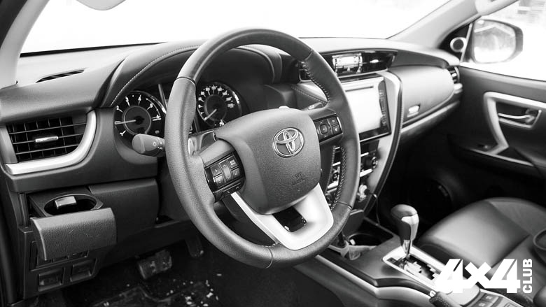 Итак, Fortuner представляет собой однообъёмный автомобиль классической схемы. В отличие от Toyota LC Prado, крышка багажника открывается вверх, а запаска закреплена под днищем в заднем свесе. Передняя подвеска – независимая двухрычажная, задний мост – на четырёх рычагах с тягой Панара. И спереди, и сзади в дополнение к пружинам установлены стабилизаторы поперечной устойчивости. В фарах использована тойотовская технология Be-Beam LED, что даёт ровное световое пятно с чёткой границей ближнего света. Автомобиль предлагается на 17- и 18-дюймовых дисках – для городской динамичной езды подойдёт больший радиус, а для туризма с элементами офф-роуда я бы рекомендовал диски поменьше. Топливный бак вмещает 80 литров дизеля, которых при спокойной езде в смешанном цикле хватает примерно на 700 км – что, согласитесь, совсем неплохой результат.