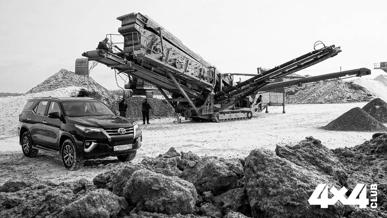Короткий мужской разговор задаёт вектор всему происходящему. В карьере уже работают четыре Hilux шестого поколения. Значок Toyota даёт зелёный свет на въезд, и мы устремляемся по слегка замёрзшему грунту, присыпанному снегом, на самое дно разработок. И через секунду – бабах! – машина проламывает задними колёсами лёд, проваливается в глубокую тракторную колею и встаёт. Лёгким движением мой напарник переводит шайбу в положение 4H. Машина смещается немного вправо, но не прямо. Через нейтраль врубаем понижайку – 4L… Снова никак! Впрочем, я спокоен: в карьере работает трактор, и бежать не так уж далеко… Даём Fortuner последний шанс, блокируя задний дифференциал. С первого же ровного нажатия педали газа машина скачком вырывается из плена. Да-а-а! Блокировка – полезная вещь, но испытания на этом не закончились. Скрепя сердце и уповая на оформленное КАСКО, мы штурмуем крутой карьерный склон (конечно, на понижайке). Колёса цепляются за подмёрзшие комья песка, и мы медленно и аккуратно забираемся на самый вверх, чтобы тут же опробовать электронный помощник при спуске. Встаём на ту же горку, но уже «мордой» вниз, нажимаем кнопку, отпускаем все педали и под стрекот тормозов, аккуратно, не сползая ни вправо, ни влево, возвращаемся на дно карьера. Три работника у карьерного погрузчика крепят тяжелый стальной трос. Нам же никакой трос не понадобился. Навыки езды по бездорожью, трезвый ум, наличие КАСКО, парт-тайм… Старый добрый парт-тайм, которого так боятся водители, пересаживающиеся с кроссоверов с условным полным приводом на настоящие внедорожники, доказал свою работоспособность и готовность к любым офф-роудным перипетиям…