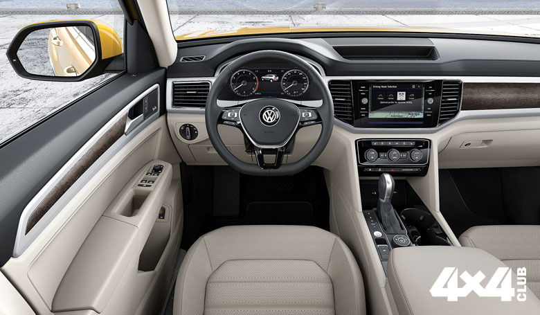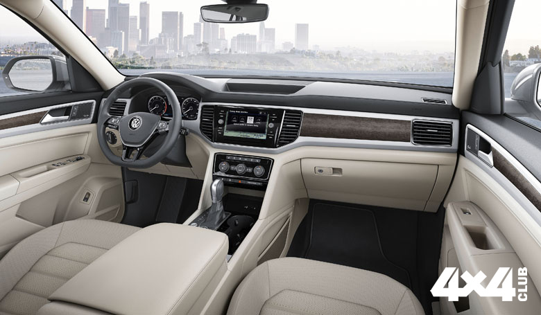 Американский Atlas в базе имеет передний привод, 2-литровую турбочетвёрку мощностью 235 л.с., 8-ступенчатый автомат, три ряда сидений с комбинированной тканевой обивкой, двухзонный климат-контроль (отдельно для передних и задних пассажиров), мультимедиасистему с экраном 6,5 дюймов, светодиодный головной свет и клиренс 203 мм.