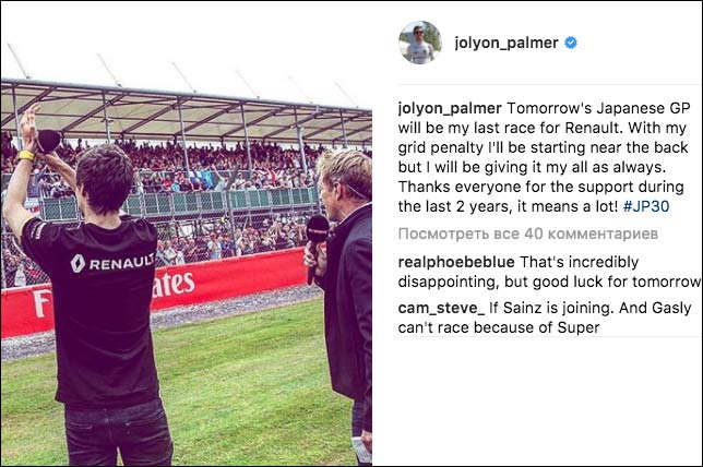 Джолион Палмер на своей странице в Instagram объявил о том, что завершит выступления за Renault F1 уже после Гран При Японии. Продолжит ли он карьеру где-то ещё, пока неизвестно…