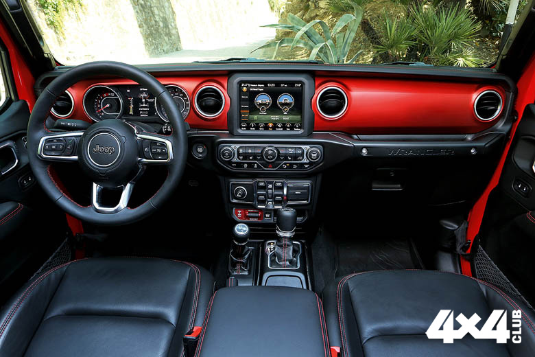 А что внутри? Прежде всего производители говорят, что салон теперь вполне можно мыть из шланга. Интересно, кто рискнёт поливать водой новую медиасистему Uconnect с опционным 8.4-дюймовым экраном, даже если прикрыть её резиновым чехлом?! Впрочем, и кроме неё здесь хватает поводов для короткого замыкания — раздельный климат, кнопочное зажигание с системой «старт/стоп», круиз-контроль, приборная панель с цветным семидюймовым дисплеем. Идеально чёткая графика! В недрах меню найдутся все возможные виртуальные приборы — уровень зарядки аккумулятора, температура и давление масла, температура охлаждающей жидкости и трансмиссии (кстати, её работа наглядно проиллюстрирована). Не забыты и альтиметр с креномером. Хотите подключить смартфон — пожалуйста, протоколы Apple CarPlay и Android Auto к вашим услугам. Руль с полным набором дублирующих кнопок и подогревом регулируется теперь не только по углу наклона, но и по вылету. Розеток на 12V и портов USB хватит на всех (за доплату устанавливается инвертер на 230V). На фоне этого великолепия парктроник, контроль слепых зон и задняя камера с динамической разметкой воспринимаются как нечто само собой разумеющееся. Более того, возникает вопрос, почему камера только одна? Зато к посадке за рулём вопросов нет. Да, сидеть приходится вплотную к двери, зато в удобном кресле с хорошим профилем спинки и педалями на комфортной высоте. В короткой двухдверной версии на зажатом между колёсными арками заднем диванчике ожидаемо тесно, но для большой компании есть пятидверный Unlimited. В нём сзади вполне удобно двум взрослым пассажирам, причём спинка центральной секции откидывается вперёд, превращаясь в широкий подлокотник с подстаканниками. Жаль, что даже пятидверка не может похвастать просторным багажником — трубы силового каркаса и объёмные боковые панели съедают много полезного пространства. Но то, что остаётся, хорошо организовано — есть крепёжные кольца, а под накладкой в полу — гнёзда для болтов от снятых дверей и крыши.