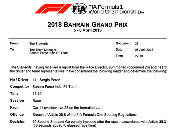 Стюарды указали, что Перес «не предпринял никаких заметных усилий, чтобы вернуть позицию». В то же время они отметили, что и Хартли тоже не вернулся на своё место. При этом он и не заехал на пит-лейн, как того требуют правила в том случае, если гонщик находится не на своём месте.