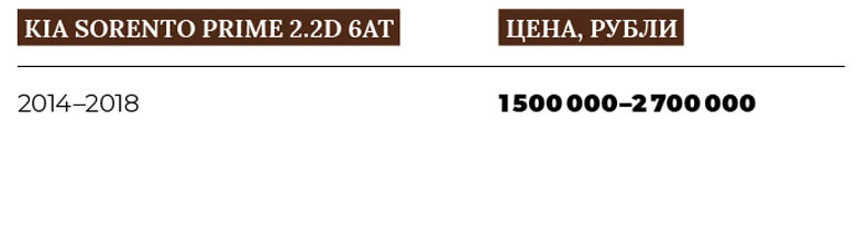 На рынке подержанных автомобилей KIA Sorento Prime прочно удерживает ценовую позицию «за миллион». Дешевле бывают только проблемные или аварийные машины. Несмотря на то что конкуренция в этой нише высока, спрос на «корейский премиум» есть и он вполне оправдан. Машина недорога в обслуживании, вполне надёжна и в дизельном варианте очень экономична. Она терпеливо переносит эксперименты вроде увеличения дорожного просвета или чип-тюнинга, она комфортна, отлично управляется и неплохо выглядит. При этом не стоит ожидать от Sorento Prime слишком многого — всё-таки это не совсем премиум. Но где-то близко…