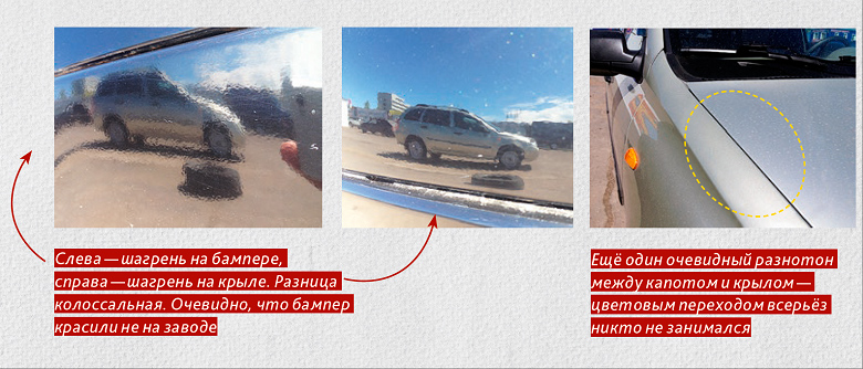 Лучше всего разнотон виден на расстоянии примерно десяти метров. Заметить крашеные места можно не только по оттенкам, но и по разному качеству покрытия, по шагрени, по волнам краски, подтёкам или разнице в эффекте металлик. Потренируйтесь на машине, у которой точно есть неродной окрас. Наверняка у кого-то из друзей машина была в ремонте, пусть даже косметическом.