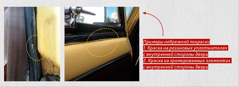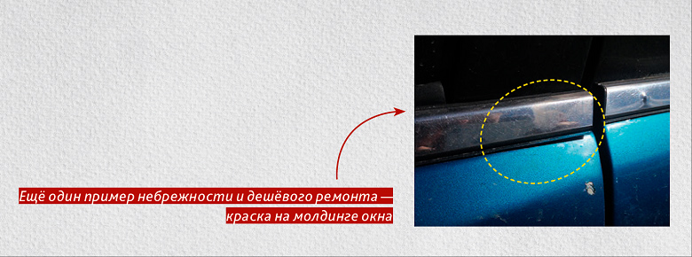 При небрежной покраске (обычно на недорогих автомобилях) можно обнаружить следы краски на резиновых уплотнителях, молдингах и пластиковых деталях. Они возникают из-за ленивых маляров, которые не хотят демонтировать и разбирать детали перед покраской и просто оклеивают соседние поверхности малярным скотчем (герметичность в этом случае почти всегда неидеальна). Так что, если вы вдруг заметили такую небрежность, должен возникнуть вопрос не только об аварии, но и о том, насколько качественно машину восстанавливали.