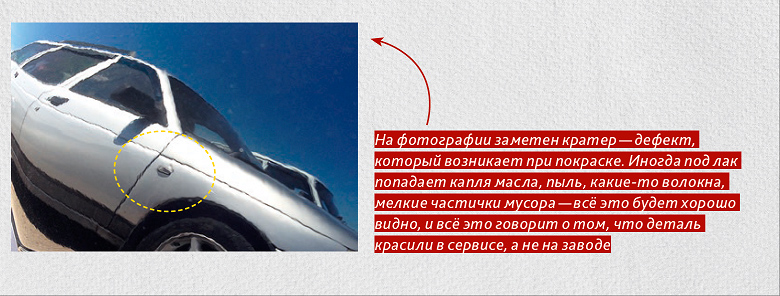 Небольшие кратеры (впадинки, углубления, точки) на покрытии образуются из-за того, что на эмаль при обработке лаком попала микрокапелька силикона или масла. В результате образуется подобие ямки, в которой нет лака. Исправить этот дефект крайне сложно и затратно, так что в большинстве случаев всё оставляют как есть. Заметить такие кратеры несложно, но нужно быть внимательным и смотреть под углом. Они редко встречаются поодиночке, так что, если заметили один, где-то должны притаиться и другие.