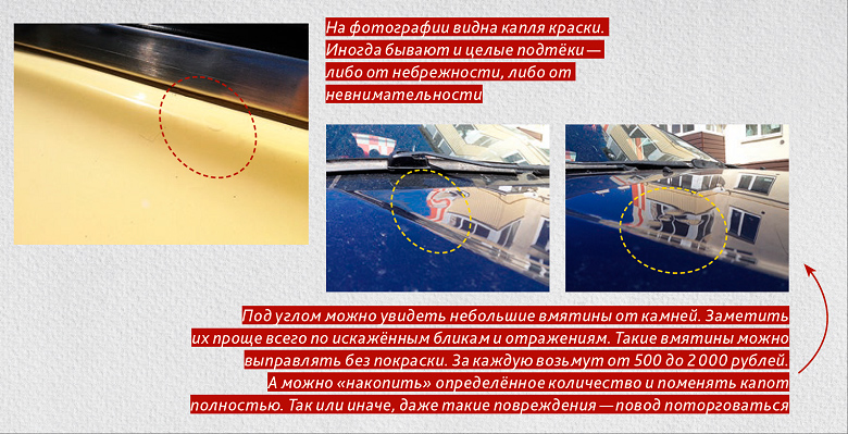 И потом, многое зависит от того, где и что показывает толщиномер. Скажем, задние крылья почти никогда не меняют, а выправляют и шпатлюют. В этом нет ничего критичного. Подкрашивание и перекрашивание бамперов — вообще обычное дело, и, если всё остальное в порядке, бояться нечего. А вот если стойки кузова или пороги шпатлёванные, значит, авария была серьёзной и лучше сразу отправляться на осмотр другой машины.
