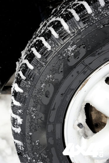 И на льду, и на снегу шипованные покрышки лучше работают с пониженным давлением. Связано это с необходимостью надёжного зацепления шипов, которое возможно только при максимальном охвате препятствия протектором. А, как вы понимаете, достичь этого можно только при некотором сплющивании колеса. Так что смело снижаем давление! Остаётся вопрос: насколько, до каких величин? Ответ, как всегда, неоднозначен. Если покрышка большого размера (больше 31 дюйма), да ещё и оснащена устройством, предотвращающим разбортирование (бэдлоки), то можно и до 0,5 атм, и даже ниже. Покрышки обычного размера достаточно будет сдуть до 0,8–1,0 атм. И разница сразу станет заметна! Там, где вы только что отчаянно буксовали, машина поедет без всяких усилий. Это работает и в ледяных колеях, и в лужах, дно которых покрыто льдом, и даже на целине. Особенно легко машина пойдёт по весенней целине, ведь спрессованный снег под шинами сразу превращается в лёд. А шипам, как мы знаем, лёд не помеха. Кстати, давайте ещё раз вспомним, что такое снег. Снег — это лёд, просто в разрыхлённом виде. Как только по нему проезжает автомобиль, укатывая его шинами, словно катком, он, спрессовываясь, принимает своё изначальное состояние, то есть становится льдом. Поэтому шипы хороши и на заснеженном просёлке, и даже на целине, особенно если это не рыхлый снег в начале зимы, а плотный, ближе к весне.