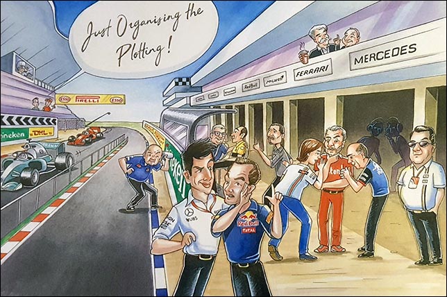 В 2018-м открытка посвящена закулисным встречам руководителей команд – и рождению интриг, без которых невозможно представить паддок Формулы 1. «Всё заговоры плетём!», — радуется за бывших коллег Экклстоун.
