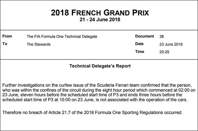 В субботу сотрудники Ferrari нарушили это правило, но поскольку это было первое нарушение команды по ходу сезона из двух разрешенных, обошлось без наказаний.