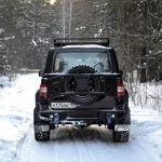 От перечня силовых составляющих набора перейдём к элементам стайлинга. И первыми менять восприятие экстерьера УАЗа должны расширители арок. Эти пластиковые детали — неизбежный атрибут любого подготовленного внедорожника. Даже небольшое увеличение покрышек ведёт к забрызгиванию стёкол грязью и интенсивному пескострую всей машины на трассе. Единственный вариант защиты — расширители. Кроме функциональной нагрузки, они придают внедорожнику вид грозного покорителя пространства и делают его зрительно больше. Дополняют расширители брызговики из гибкого износоустойчивого полиуретана. Но и здесь важен элемент красоты — брызговики украшены накладками из нержавеющей стали, придающими оформлению низа машины законченный вид. В салоне BMS рекомендует установить обшитый кожей руль и сиденья с яркой обивкой.