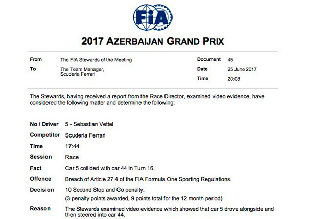 Стюарды оставили без внимания первое столкновение, а вот второе не прошло для Себастьяна бесследно – за преднамеренное столкновение они наказали пилота Ferrari 10-секундным Stop&Go. Кроме того, Феттель получил три штрафных балла, и теперь на счету немца их 9.