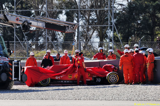 Неудачно складывается шестой день тестов в Барселоне для Ferrari – Себастьян Феттель повредил машину. Немец проехал по прямой в третьем повороте, пересек гравийную ловушку и ударился носовым обтекателем в защитный барьер. Позднее в Ferrari подтвердили, что причиной вылета стали механические проблемы.