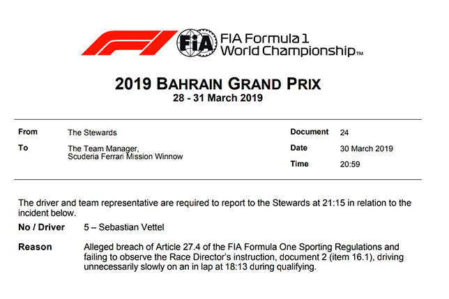 Стюарды Гран При Бахрейна после окончания квалификации вызвали к себе Себастьяна Феттеля и представителя команды Ferrari для разбирательств. Феттель подозревается в том, что «неоправданно медленно» ехал по трассе в начале второй сессии.