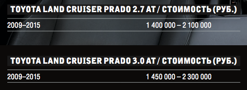 На российском рынке подержанные автомобили Prado J150 можно найти в любой комплектации, любого цвета и с любым мотором. Предложений более чем достаточно, но и ценник довольно высокий. Оптимальным по затратам будет бензиновый вариант с прозрачной историей, мотором 2.7 литра и 5-ступенчатым автоматом. В общем, покупка Toyota Land Cruiser Prado может стать неплохим вложением денег, особенно если вы цените надёжность, собираетесь прожить долгую жизнь, и привыкли ориентироваться не на внешнюю красоту, а на внутреннее содержание.