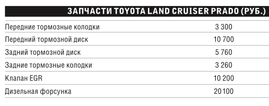 Втулки стабилизаторов живут недолго, особенно у активных водителей, но в среднем год выхаживают. Амортизаторы в целом надёжны, а вот ступичные подшипники передних колёс не столь выносливы. Настоящий же бич всех «гонщиков» — быстрый износ тормозов. Колодок может не хватить и на 15 000 км, при том что диски выдерживают раз в десять дольше. Как и все современные внедорожники, Toyota Prado имеет постоянный полный привод с блокировкой межосевого дифференциала. Причём он может блокироваться и автоматически, и принудительно. Привод надёжен, а наличие как механических, так и электронных ассистентов серьёзно увеличивает шансы заночевать дома, а не в лесной колее. Короче говоря, ассистентов много, но все они надёжны. Подвести могут разве что камеры обзора, которые и показывают кривовато, и грязью быстро забрызгиваются, и отказывают по непонятной причине. Так что не привыкайте ездить по камерам.