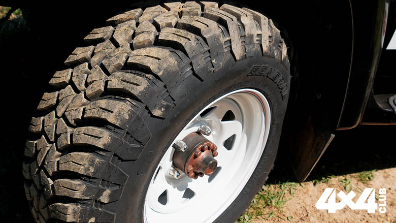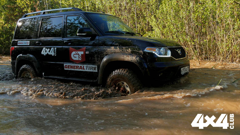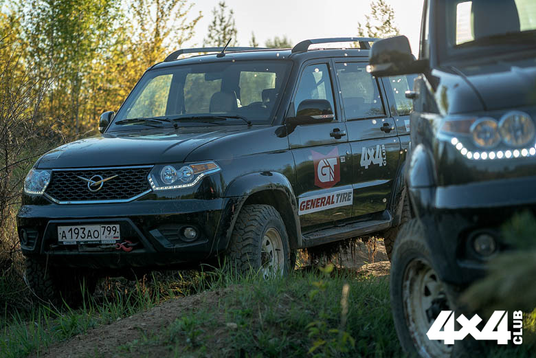 Шины известной американской марки General Tire серии Grabber моделей AT3 и X3, то есть All-Terrain и Mud-Terrain, мы надели на белоснежные стальные диски Off-Road Wheels 8×16 ЕТ22 и установили на УАЗы «Патриоты» в максимальных комплектациях, причём один из них в версии «Мехвод контужен!», в смысле World Of Tanks. Резину мы выбрали размерностью 245/75 R16, которая гарантированно встанет на «Патриоты» и не будет ни за что задевать при самой жёстокой артикуляции. Напомню, в штатном расписании на УАЗы определены шины размерностью 225/75 R16 в недорогих версиях и 245/60 R18 в максимуме. Таким образом, мы на дюйм превысили заводской параметр, что вполне допустимо. На шиномонтаже нас приняли благосклонно. Интересно, что МТ-шины поддались монтажу несколько менее охотно, чем АТ, но серьёзных проблем не возникло. Обе отличаются очень мягкой резиной, которую можно продавить буквально пальцем. Но не везде. Если боковина мягкая, включая усиление, то беговая дорожка вполне себе твёрдая. Взвешивание показало отсутствие разницы в массе шин и, как следствие, собранных колёс. Обе потянули на 22 кг без диска и совершенно ошарашили 34 кг в собранном виде… Я, конечно, понимаю, что диски Off-Road Wheels – это самая красивая деталь автомобиля, но плюс 12 кг на единицу продукции – это перебор! Зато гайки, предназначенные для литых дисков, подошли как родные. Неудивительно, учитывая, что толщина диска в месте крепления к ступице – 8 мм. На балансировке шиномонтажник похвально поцокал языком, мол, 60 грамм на такой резине – очень хорошо! К слову, General Tire Grabber размерностью 245/75 R16 в точности совпадают с калькуляторными 30.5 дюйма, то есть 773.9 мм (я проверял), причём, что немаловажно, и АТ, и МТ. При этом визуально грязевые шины выглядят будто бы уже. Это из-за разреженных ступенчатых блоков плечевой зоны. Если приложить линейку, то по беговой дорожке получим строго 245 мм. Первые километры по асфальту показали, что шумнее в салоне УАЗа не стало – ни на малых скоростях, ни на полных, ни с МТ, ни с АТ. Асфальтовые тесты в наши планы не входили, но могу сказать, что в штатных режимах никакой разницы по сравнению с только что снятыми R18 Pirelli Green мы не заметили, не считая улучшившейся плавности хода из-за большего профиля и того, что мы сразу выставили «гравийное давление» – 1.8 атм., чтобы было, так сказать, и в мир, и в пир. Вообще, в дальних пробегах лучше держать рекомендованные производителем 2.2 атм., но если недалеко и больше по проселку, то можно даже 1,6 атм