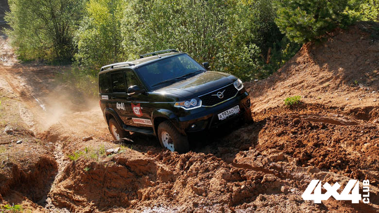 Мы долго колесили по карьеру, но никак не могли нащупать различия в поведение шин. Пока не набрели на небольшой участок подсохшего глинистого пруда. Первым туда сунулся УАЗ на All-Terrain и мгновенно провалился на весь профиль, тут же забуксовав. Медленно откатываемся назад – не едет. Придётся раскачиваться, кто знает насколько тут глубоко, а впереди крутой подъём. К счастью для меня как пилота и к несчастью для меня как тест-пилота под пятнадцатисантиметровым слоем тестоподобной глины оказалась твёрдая подложка, и, поелозив для порядка, я обрёл сцепление с родной планетой. Небольшой разгон и упорное буксование на подъёме – ни в натяг, ни с умеренного разгона забраться не получалось. Противобуксовочная очень старалась, но мгновенно забившаяся липкой субстанцией атэшная шина никак не хотела очищаться. Поддал газку, буксанул – и ничего… Грязь с боковин и самые большие куски слетели, обнажив кое-где плечевую зону протектора, но беговая дорожка так и осталась «сликом». Пришлось блокировать задний дифференциал, сдавать почти в самую грязь и хорошим рывком с места впрыгивать на склон. Только тогда всё получилось. А вот МТ-резина повела себя довольно странно. Без проблем преодолев грязевой участок, УАЗ встал на подъёме как вкопанный. Колёса крутятся, машина не едет… Замылились? Ещё бы! Но короткий удар по педали газа – и «Патриот», лязгая мостом и расшвыривая комки серой глины, взлетает наверх. Пробуем ещё раз. Теперь All-Terrain идет немного увереннее и взбирается на подъём на ровном газу на второй пониженной. Растоптали грязь… Понятно, что у Mud-Terrain проблем ни с лужей, ни с подъёмом не возникло совсем. На третий раз мы даже специально останавливались в конце подъёма и, слегка подбуксовывая, вползали на склон. Причём беговая дорожка АТ так до конца и не очистилась, а вот протектор МТ был виден, так сказать, до дна.