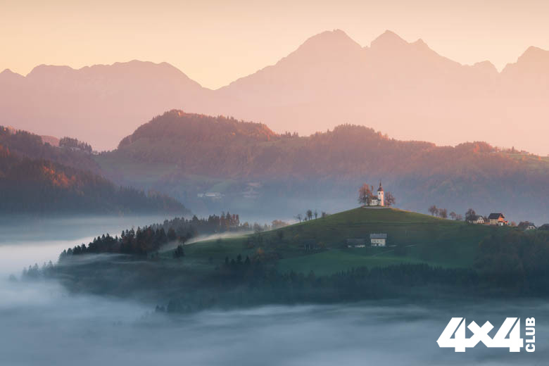 В Словении насчитывается более тысячи церквей. Для такой небольшой страны это по-настоящему удивительно, ведь почти на каждом холме возвышается прекрасный храм. Например, этот кадр снят в городке Шкофья-Лока. Мы с другом отправились туда на Volkswagen Tiguan со стороны озера Блейско. Конечно, добраться можно было и на легковой машине, но местами дороги совершенно убитые, особенно в горах ближе к вершинам. На SUV намного комфортнее, тем более зимой, когда на этой точке всё занесено снегом.