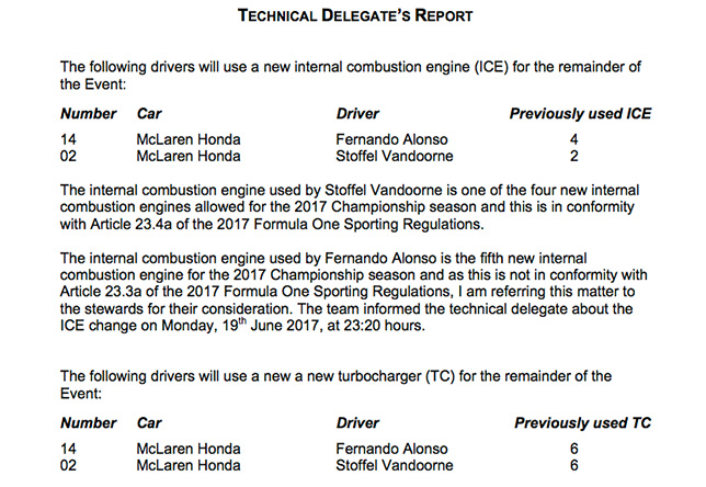 Таким образом, на настоящий момент Фернандо в этом году уже использовал 5 двигателей внутреннего сгорания, 5 мотор-генераторов MGU-K, а также 7 турбокомпрессоров и мотор-генераторов MGU-H. Из-за нескольких замен элементов силовой установки, произведённых в этот уик-энд, штраф достиг 40 стартовых позиций.