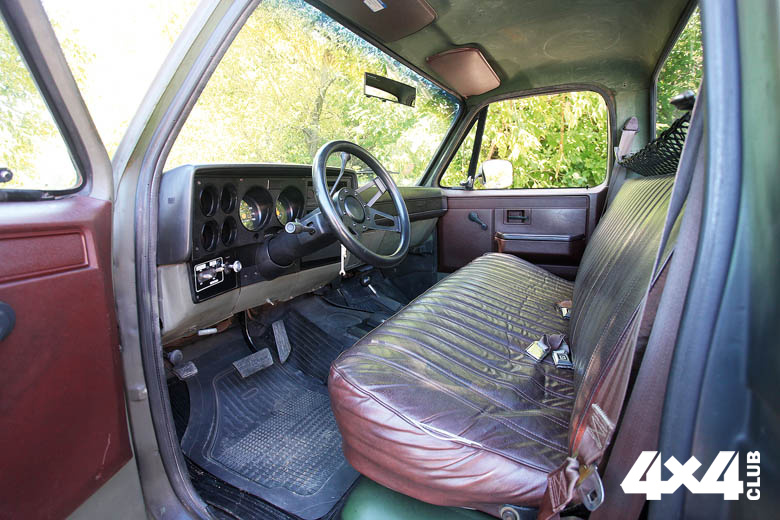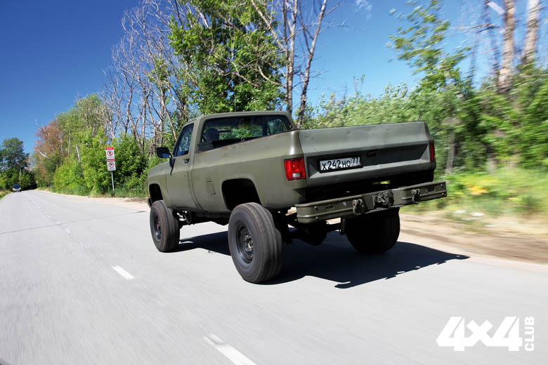 Рычаги не дрожат мелкой дрожью, руль не зудит в руках, и, несмотря на почти полное отсутствие настроек, сидеть за баранкой на мягком кожаном трёхместном диване со сплошной подушкой и спинкой очень удобно. В армии американцы, так же как и на гражданке, предпочитают автомат, поэтому в нашем Chevrolet стоит стандартная трехступенчатая АКПП GM TH400 (Turbo Hydramatic 400) и раздаточная коробка NP 208 (New Process 208) с понижающим редуктором. Перевожу в «драйв» подрулевую кочергу и едва прикасаюсь к педали газа — К‑30, немного подумав, мягко трогается с места и неспешно набирает скорость. До 30–40 км/ч обороты почти на минимальном уровне, к 50 км/ч автомобиль начинает потряхивать как на мелкой гребенке, хотя под нами почти ровный асфальт (очень тяжёлые колёса не балансировали), появляются резонансные колебания, но стоит чуть прибавить скорость, и они исчезают. В целом плавность хода почти сорокалетнего Chevrolet K‑30, немало повидавшего на своем веку, не хуже, чем, например, у нового УАЗа «Профи», а управляемость приятно удивляет. Гидроусилитель настолько мощный, что и с маленьким тюнинговым рулём, установленным вместо широкой и тонкой баранки, положенной по штату, колёса без усилий поворачиваются на месте. Руль не люфтит, курсовая устойчивость хорошая, не нужно ловить машину по всей дороге, даже если под тобой колея, в повороты К‑30 заходит как большой внедорожник, а не грузовик, необходимый минимум обратной связи имеется. Благодаря тонким стойкам и огромным информативным зеркалам у пикапа отличная обзорность, квадратные габариты прекрасно читаются, но видеокамеру на задний борт я бы повесил — стальному бамперу от удара хуже не будет, а вот окружающие объекты могут пострадать. Избежать таких неприятностей помогают отличные тормоза — чувствительные, с небольшим свободным ходом, даже резкое замедление не требует топтать педаль изо всех сил. Что удивительно, ведь на К‑30 установлена обычная гидравлика с барабанами сзади и дисками спереди, а не гидропневматическая тормозная система. А вот ускорение, наоборот, не впечатляет, и это вполне логично — многолитровый дизельный атмосферник крутится с огромным трудом, не позволяя резко прибавить скорость, любой обгон для него — знаменательное событие, да и шум мотора в почти лишённой звукоизоляции кабине заглушает все звуки. Крейсерская скорость, на которой мотор не перекручивается, а с пассажирами ещё можно о чём-то разговаривать — примерно 80–90 км/ч, расход топлива при этом — не больше 15 л на 100 км, причём он практически не меняется при полной загрузке.
