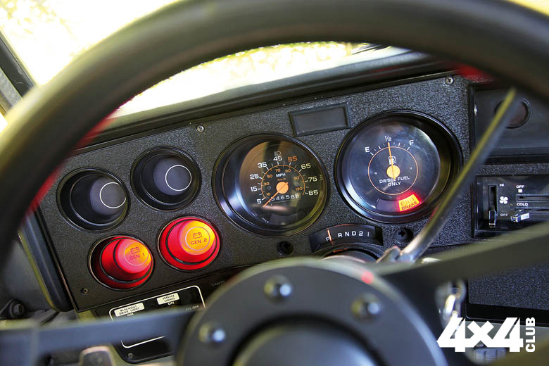 Увидеть на московской улице Chevrolet K‑30 — всё равно что по дороге в булочную встретить слона. Замечаешь краем глаза что-то совершенно не вписывающееся в привычную картину окружающего мира, присматриваешься и застываешь в изумлении — надо же, стоит и никуда не исчезает! Я почти час вертелся вокруг с телефоном, фотографируя его с разных ракурсов и надеясь когда-нибудь дождаться хозяина. Но в итоге сработали социальные сети — я выложил фото, и через несколько дней мы уже договаривались о встрече. На владельца К‑30 вывели его соратники — «американисты». Оказалось, что Андрей — известный в кругах любителей старых «траков» энтузиаст с огромным опытом эксплуатации и ремонта подобной техники, а Chevrolet K‑30 — далеко не первый в его коллекции. Приобрел он его, кстати, тоже по счастливой случайности — наудачу спросил бывшего владельца и оказалось, что пикап продаётся. Ещё более удивительно то, что К‑30 был в очень приличном для подобной техники состоянии — ни сквозной коррозии, ни серьёзных проблем с агрегатами, только борта были слегка пожёваны. Однако кузов и кабину удалось привести в порядок без особых вложений, даже полной перекраски не понадобилось, и пикап до сих пор в родном матово-зелёном военном мундире. Двигатель и трансмиссию Андрей как следует проинспектировал, но тоже не нашёл каких-то неисправностей, обслужил, отрегулировал — и всё заработало как положено. Правда, на штатных колёсах К‑30 смотрелся немного странно, а главное — слишком маленькая размерность не позволяла ездить с приемлемой по сегодняшним меркам скоростью. В штатах Андрей заказал лифт-комплект от Pro Comp. С помощью удлинённых серёг, новых рессор и амортизаторов машину удалось поднять на четыре дюйма, ещё три дюйма дали проставки под раму. В результате семидюймовый лифт позволил установить колёса от Hummer размером 37/12.5 R16, да не простые, а на разборных дисках с противопулевыми вставками. Каждое из них весит около семидесяти килограммов, однако никаких изменений в трансмиссии не понадобилось, да и запас прочности оригинальных мостов с главной парой 4.56 практически бесконечен. Впереди стоит крепчайший Dana 60, сзади — корпоративный джиэмовский четырнадцатиболтовый мост с автоматической блокировкой Detroit Locker. Мотор легко проворачивает хаммеровские катки, ведь под капотом Chevrolet K‑30 — атмосферный 6.2-литровый дизельный V8 Detroit Diesel мощностью 135 л. с. при 3600 об/мин, крутящий момент — 325 Нм при 2000 об/мин. Ни мощность, ни тяга на первый взгляд не слишком впечатляют, ведь сегодня с такого колоссального объёма сняли бы гораздо больше, но и того, что есть, хватает за глаза. И за уши. Я даже не знаю, с чем сравнить работу этого агрегата! На приборном щитке нет тахометра, но холостой ход, похоже, около 600–800 оборотов в минуту.