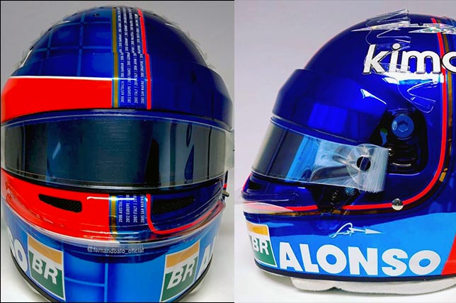 Новая раскраска состоит из двух частей, разделённой вертикальной полосой и перечислением 32-х гонок, которые Алонсо выиграл в Формуле 1. Одна половина напоминает современные цвета шлема испанца, другая – ту раскраску, что он использовал в начале карьеры.