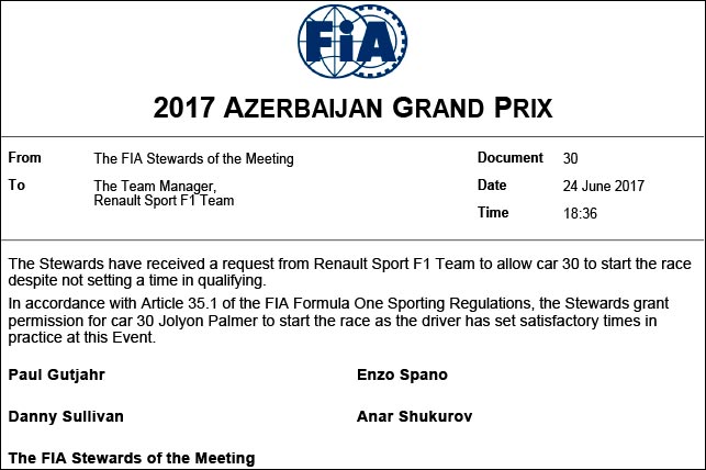 Джолион не участвовал в квалификации после возгорания машины во время субботней тренировки, но после запроса команды допущен на старт специальным решением стюардов, которые учли его результаты, показанные в прошлых сессиях.
