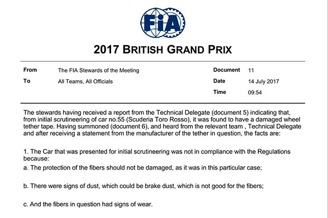 Во время технической инспекции FIA перед началом Гран При Великобритании возникла странная ситуация – на машине Toro Rosso был обнаружен повреждённый трос крепления колеса, и команда отказалась выполнить просьбу инспектора по его замене.