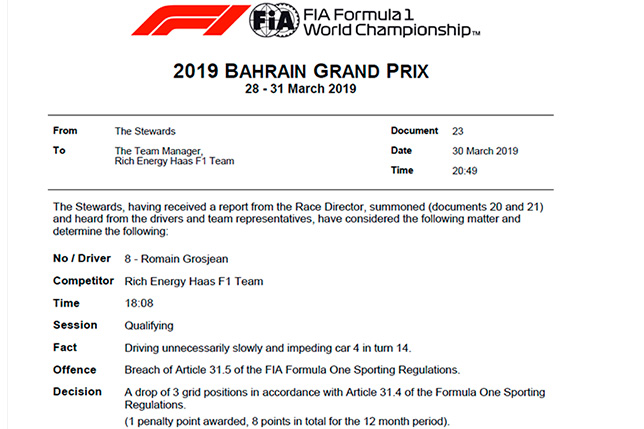 Стюарды Гран При Бахрейна после окончания квалификации наказали Романа Грожана потерей трёх позиций на стартовой решётке. Пилот Haas признан виновным в инциденте с Ландо Норрисом, и начнёт гонку не восьмым, а 11-м.