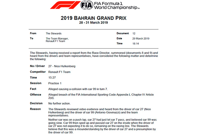 По ходу первой тренировки в Бахрейне произошёл инцидент между Антонио Джовинацци и Нико Хюлкенбергом — машины столкнулись, оба пилота оказались за пределами трассы. После сессии стюарды вызвали к себе обоих гонщиков, но по итогам разбирательства решили никого не наказывать.