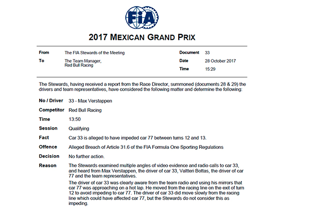 Квалификация в Мексике оказалась лучшей в карьере для Макса Ферстаппена, он едва не завоевал поул, однако мог потерять и вторую позицию – в своей первой попытке в финале он помешал Валттери Боттасу. Стюарды вызвали к себе обоих пилотов, выслушали их версии, затем изучили видеоматериалы и в итоге решили никого не наказывать.