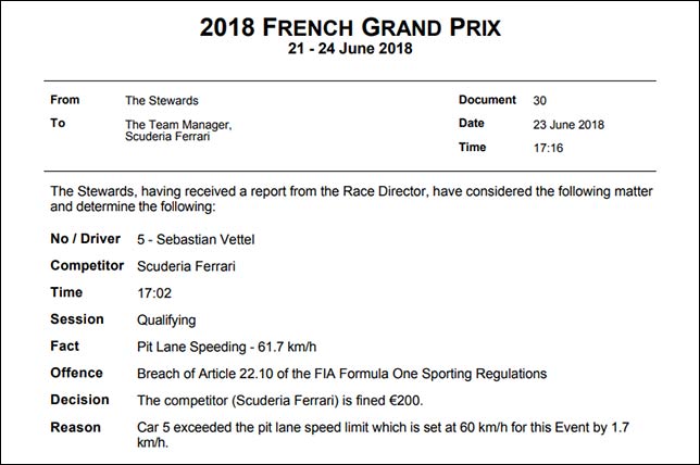 Вместо разрешенных 60 км/ч немец проехал со скоростью 61,7 км/ч – стюарды наказали Ferrari денежным штрафом в 200 евро.