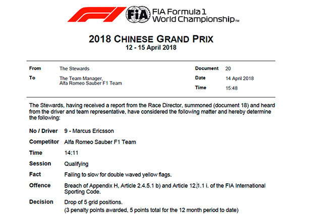 Стюарды Гран При Китая оштрафовали Маркуса Эриксона за то, что он не сбросил скорость под двойными жёлтыми флагами во время квалификации. Флаги были вызваны разворотом его напарника Шарля Леклера, но, как отметили стюарды, Маркус не только пытался показать хороший результат на этом секторе, но даже не сбросил скорость непосредственно в районе инцидента.
