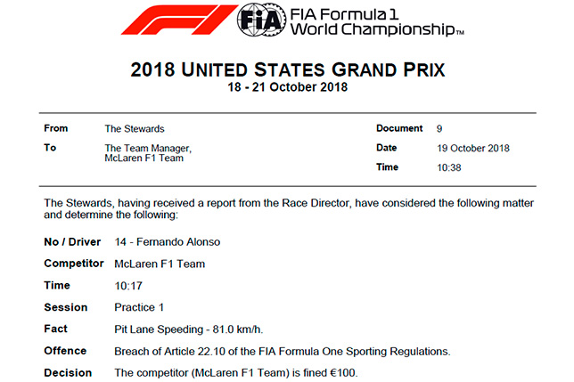 По ходу первой пятничной тренировки Гран При США Фернандо Алонсо превысил скорость на пит-лейн. Вместо разрешённых 80 км/ч испанец разогнался до 81 км/ч.
