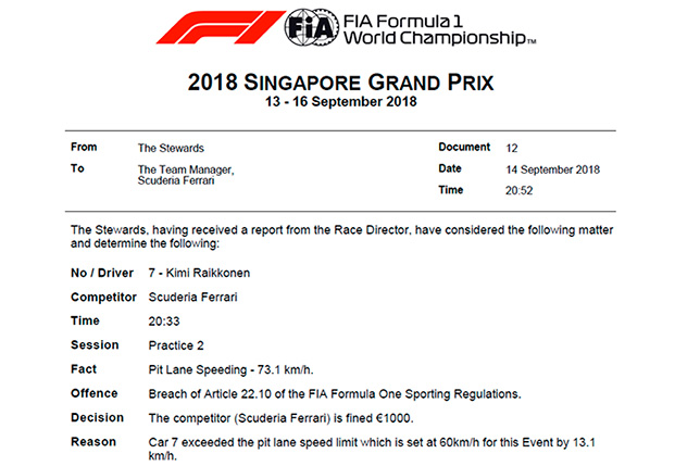 Нико Хюлкенберг проехал по пит-лейн со скоростью 62,8 км/ч вместо разрешённых 60 км/ч, и команда Renault заплатит за это 300 евро. Кими Райкконен разогнался до 73,1 км/ч, и Ferrari получила за это максимальный штраф – 1000 евро.