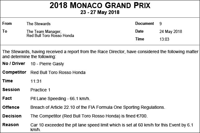 Пьер Гасли проехал по пит-лейн со скоростью 66,1 км/ч за что команде придётся перечислить FIA 700 евро.