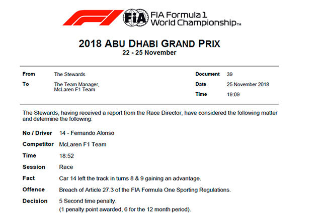 К результату Алонсо было добавлено по пять секунд за каждую срезку. На его позицию в протоколе это не повлияло, так как у ехавшего 12-м Хартли он выигрывал более 20 секунд. Кроме того, за каждый эпизод Фернандо получил по одному штрафному баллу. Теперь у Алонсо таких баллов шесть, но учитывая, что он не планирует выступать в Формуле 1 в 2019 году, для него это не имеет особого значения.