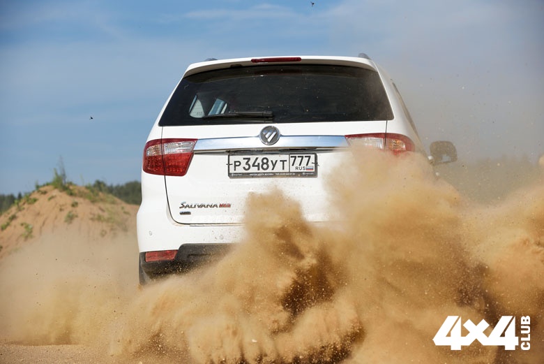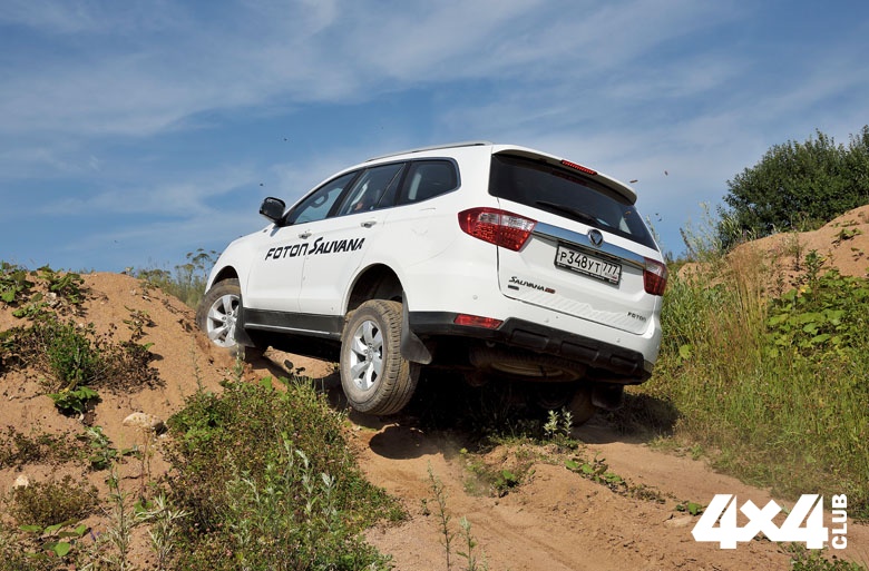 Итак, газ в пол, траектория по грунту примерная. Нет необходимости рулить точно, ведь сзади здесь неразрезной мост на тягах и пружинах, а спереди — поперечные рычаги на стойках Макферсона. Подвеска настолько упруга, что достать до ограничителя хода вам вряд ли удастся. В первые минуты движения по асфальту она может показаться слишком жёсткой, но, как только вы съезжаете на бездорожье, раскрывает всю свою энергоёмкость. Сегодня эти ощущения почти забыты. Так ездили внедорожники, которые мы теперь называем старыми добрыми, но Foton Sauvana совершенно новый. Всё встаёт на свои места, когда выясняется, что в основе машины  — шасси, скопированное с Toyota Fortuner предыдущего поколения. Вот откуда у Sauvana такая любовь к поеданию кочек. Она на генетическом уровне передалась от японских внедорожников, а уж они-то, как известно, умели летать над неровностями рельефа.