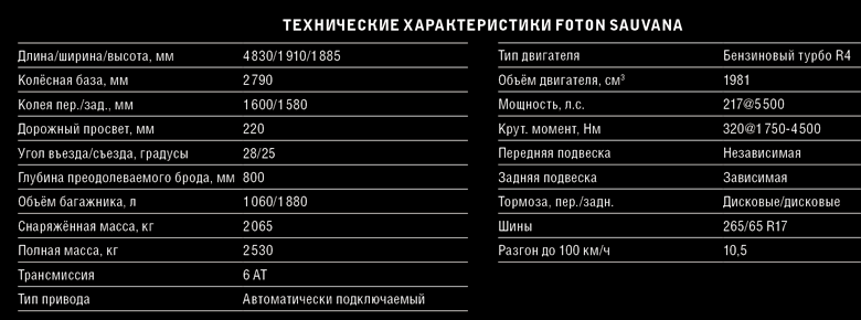 Какой из этого следует вывод? Foton Sauvana хорош и на асфальте, и на просёлке. Он тих и динамичен, не слишком прожорлив и, если вывести за скобки тяжёлое бездорожье, отлично сбалансирован. А в качестве внедорожной версии гипотетически можно было бы представить Sauvana с хорошо знакомым нам дизельным двигателем 2.8 от пикапа Foton Tunland. Тот мотор с паровозной тягой решил бы все проблемы ползучих режимов движения, хотя, возможно, слегка досаждал бы гулом на высоких скоростях. Кроме того, из бензина и дизеля вышла бы неплохая парочка, закрывающая весь диапазон спроса на подобные машины. Но пока мы имеем то, что имеем, — безальтернативный 2.0 турбо.