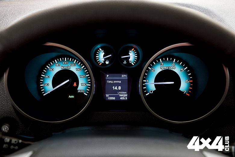 Впрочем, хороший вездеход — это не только мотор. Полноприводная трансмиссия Sauvana имеет три режима: 2H — задний привод, AUTO — автоматическое подключение передних колёс при пробуксовке задних, 4L — постоянный полный привод при пониженной передаче в раздатке. Селектор переключений электронный, тип привода — TOD, то есть межосевого дифференциала тут нет. Зато есть задний мост Dana 44 с дифференциалом повышенного трения и электронный помощник спуска с уклона. Коробок две — пятиступенчатая механика и шестиступенчатый автомат, который, помимо ручного переключения, имеет три режима: экологичный, спортивный и зимний. С учётом частично отключаемой стабилизации арсенал для штурма труднопроходимых участков внушительный. Кстати, задний дифференциал повышенного трения настроен очень удачно — его работа совершенно не чувствуется на асфальте, зато заметна на грунте. Даже на одном заднем приводе внедорожник уверенно движется по рыхлым поверхностям. Дифференциал сохраняет тягу на обоих задних колёсах и не сопротивляется в крутых поворотах.