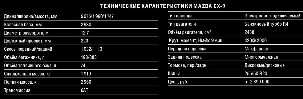 Столь же лаконична и оценка динамики. Он едет, как ездили хорошие машины в старые добрые времена. Может быть, даже чуть лучше, чем в старые. Семиместный Mazda CX-9 едет, несмотря на то что под капотом всего четыре цилиндра и 2.5 литра рабочего объёма. Продвинутое турбо? Синхронизированный выпуск? Другие фокусы с рабочим циклом хорошо известного мотора? Да бросьте, все так делают — ставят мотор поменьше, турбину побольше, настраивают и синхронизируют всё, что можно, приделывают навороченные мозги и предельно облегчают кузов. Другое дело, что заставить при этом машину нормально ехать получается не у всех. У Mazda получилось. Может быть, благодаря большому опыту по доводке спортивных моторов, а может, просто из тщеславия, мол, как это Mazda и не выстреливает как укушенная. Так вот, «девятка» выстреливает. И причиной тому — особый подход к автомобилю в целом, который в компании называют Skyactiv. Тут вам и снижение веса, и драйверские настройки подвески, и ещё много чего. Почему меня это радует? Да потому что сегодня четырёхцилиндровые моторы на больших и тяжёлых машинах стали нормой. Посмотрите — у большинства конкурентов в гамме есть обязательная четырёхцилиндровая версия, даже Porsche сподобился выпустить на рынок Macan для начинающих со скромным рядным мотором. А у некоторых, как, например, в Volvo, и альтернативы нет. Значит, пора заканчивать со вздохами по поводу былых литражей и числа «горшков» и переходить к прямым оценкам того, насколько малоцилиндровость удалась той или иной компании. Вот на что стоит обратить внимание, так это на 420 Нм крутящего момента, причём не где-нибудь, а прямо возле 2 000 оборотов. Плюс шестиступенчатый автомат без всяких там «дабл-клатч» мокрых или немокрых. Конечно, с турбиной поколдовали, и своё роскошное название Skyactiv G 2.5 T, дополненное не менее пафосным именем турбонаддува Dynamic Pressure Turbo, мотор носит неслучайно. Что ж, пускай носит — заслужил.