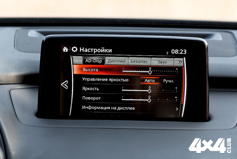Подстраивать под условия движения или под настроение водителя можно и рулевое управление. Причём регулируется даже сила и резкость воздействия на руль при автоматическом слежении за полосой. Ещё есть передняя камера, распознающая знаки, следящая за объектами и самостоятельно останавливающая машину перед ними (СХ-9 способна определить помеху спереди до скорости в 80 км/ч, а сзади — до 8 км/ч). Ещё одна фишка от Mazda — восьмидюймовый центральный дисплей, сенсорная отзывчивость которого сохраняется только до 7 км/ч. Выше, по мнению инженеров компании, отвлекаться на тыканье пальцем в экран нельзя, а всё управление надо производить дистанционно — джойстиком на тоннеле или кнопками на руле и консоли. Что ж, наверное, они правы. Имеются и проекционный дисплей, и даже система мониторинга усталости водителя, при необходимости предлагающая выпить чашку кофе. Пока, правда, лишь виртуальную — всё на том же дисплее. Даже фары головного света тут светодиодные с четырьмя сегментами и самостоятельной регулировкой светового пучка в зависимости от освещённости и наличия встречных машин… Одним словом, нынешнее поколение CX-9 упаковали под завязку.