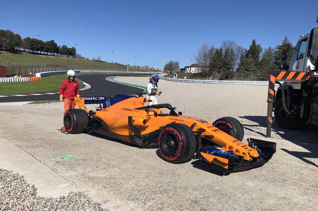 Вторая неделя тестов в Барселоне неудачно началась для команды McLaren – накануне Стоффель Вандорн дважды останавливался на трассе из-за проблем с электрикой и гидравликой. В среду за руль вернулся Фернандо Алонсо и успел проехать больше 40 кругов, но затем его машина остановилась в седьмом повороте, что привело к появлению красных флагов.