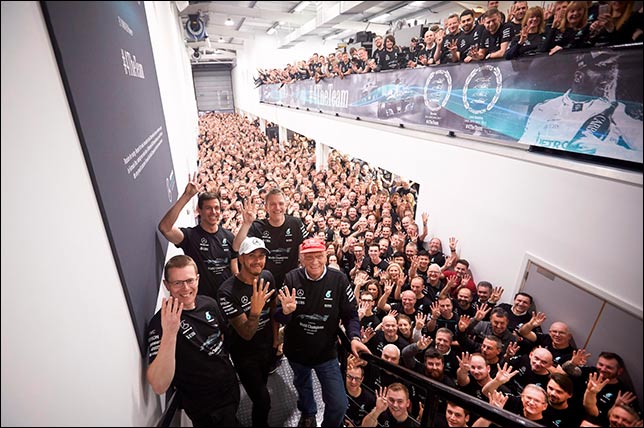 Утром на базе мотористов Mercedes-AMG High Performance Powertrains в Бриксуорте разливали шампанское, воду и соки – многочисленные сотрудники приветствовали Тото Вольффа, Ники Лауду, Льюиса Хэмилтона – и досрочную победу в чемпионате. Потом праздник продолжился на базе в Брэкли.